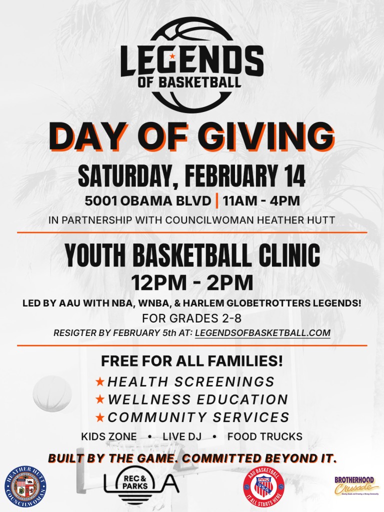 In partnership with Councilwoman Heather Hutt, Legends of Basketball invites families, youth, and community members to a free, high-impact Day of Giving—centered on youth empowerment, health, and community connection. This legends-led mentorship and on-court engagement is designed to inspire the next generation. Special appearance by the Harlem Globetrotters. Registration deadline is Thursday, February 12th.